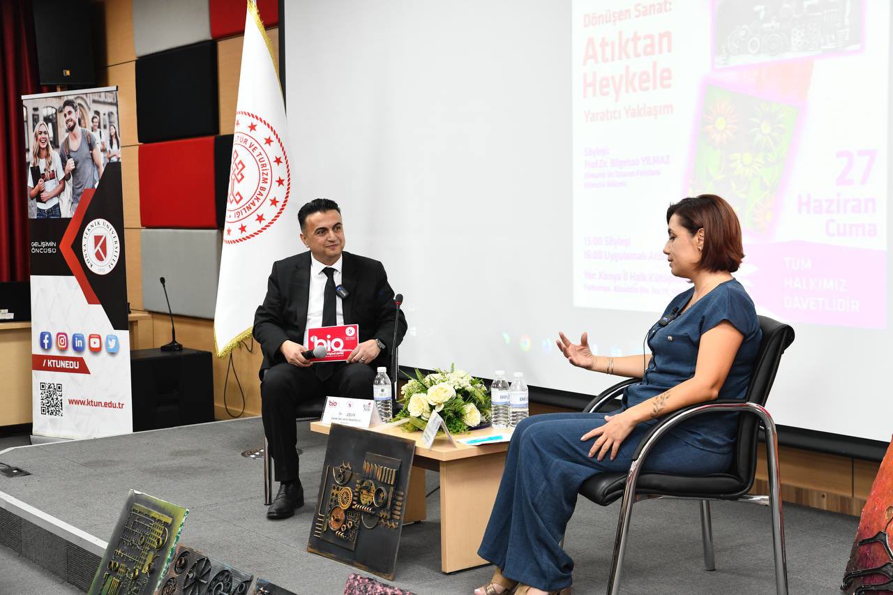 Söyleşide, atık malzemelerin sanatsal bir dönüşümle heykellere nasıl hayat verdiği ve bu dönüşüm sürecinin arkasındaki yaratıcı düşünce yapısı ele alındı. Prof. Dr. Yılmaz, disiplinlerarası bakış açısıyla bilimin sanatla nasıl etkileşime geçtiğini aktararak, atıkların yalnızca çevresel değil, estetik değerler açısından da yeniden değerlendirilebileceğine dikkat çekti.